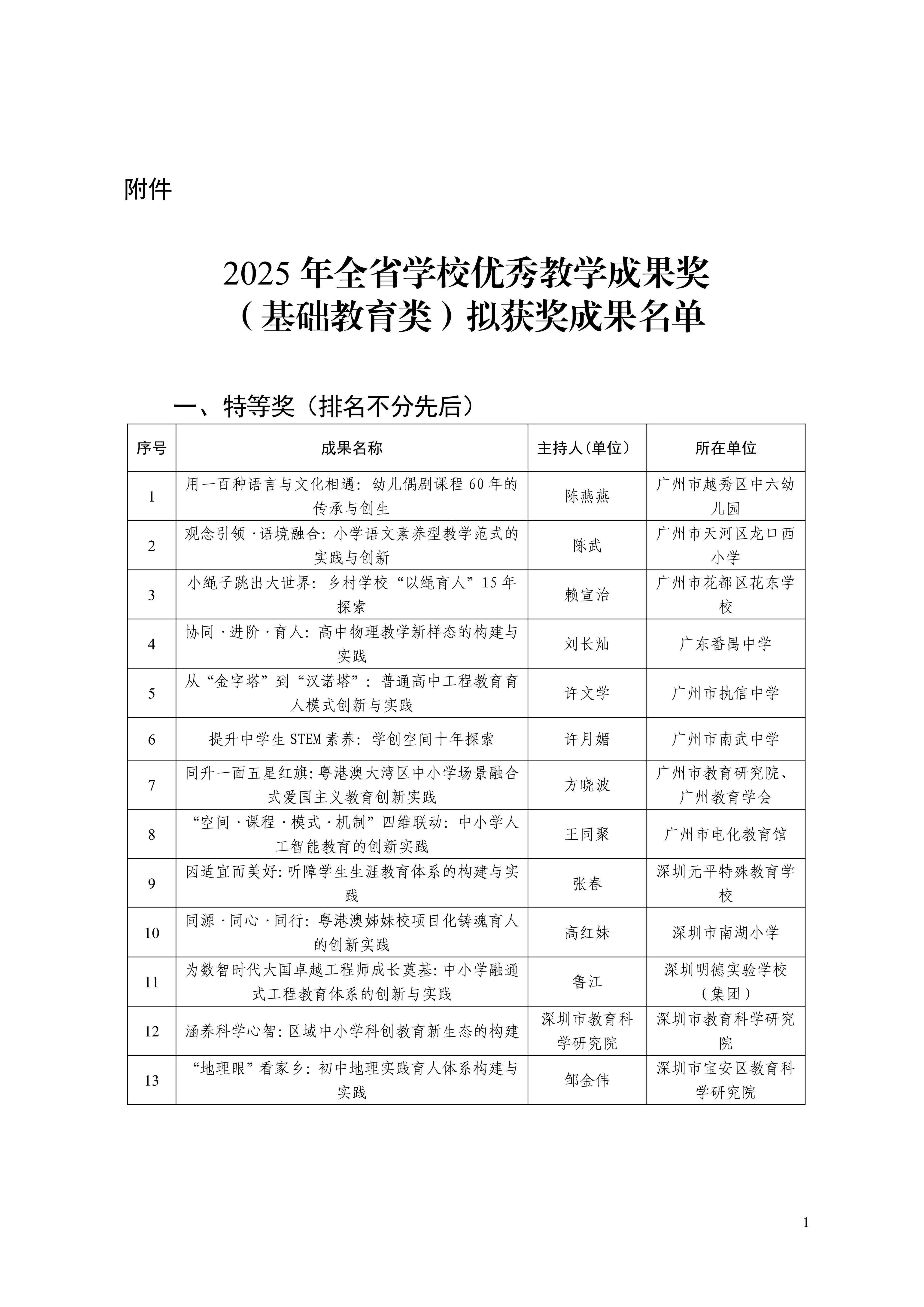 12月1日,广东省教练厅发布《对于2025年全省学校优秀涵养效果奖(基础教练类)拟获奖效果名单的公示》,经自主文书、单元遴择推选、经验审核、蓄积评审和勾通评审,拟奖励基础教练类优秀涵养效果449项,其中极端奖50项、一等奖150项、二等奖249项。